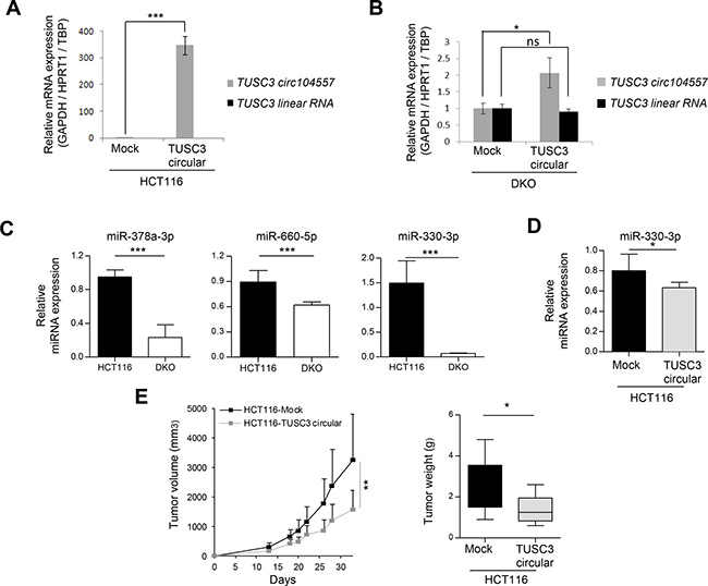 Figure 3: circRNA effects on linear transcripts, miRNAs and tumor growth. (A) Upon efficient transduction of TUSC3 circ104557 in HCT-116 cells (harboring a methylated CpG island), the TUSC3 linear RNA levels did not change: it was not detected in any of the conditions tested. (B) TUSC3 circ104557 transduction in DKO cells (harboring an unmethylated CpG island) did not affect the levels of TUSC3 linear RNA. RNA levels were determined using circular or linear specific qRT-PCR primers. The lentiviral transduction of the empty vector (Mock condition) was used as a control. Experiments were performed in technical triplicates. (C) Expression of candidate miRNAs putatively targeted by ATRNL1 circ100686 (miR-378a-3p), SAMD4A circ101356 (miR-660-5p and miR-330-3p) and TUSC3 circ104557 (miR-330-3p) was significantly downregulated in DKO cells, evaluated in three biological replicates by real-time quantitative PCR using TaqMan Advanced MicroRNA Assays. Expression levels were normalized using hsa-miR-345-5p, hsa-miR-191-5p and hsa-miR-423-3p advanced Control miRNA Assays. (D) Using the same strategy, expression of miR-330-3p, putatively targeted by TUSC3 circ104557, was also assessed in the gain-of-function cellular model. A significant downregulation of miR-330-3p was detected upon TUSC3 circ104557 transduction in HCT116 cells. (E) HCT116-Mock and HCT116-TUSC3 circular cells were injected in the left or right flank of 10 mice, respectively. Tumor volume measured over time (left panel) and tumor weight upon sacrifice (right panel) are shown. Tumor growth was significantly reduced upon TUSC3 circular ectopic expression. ns, nonsignificant; *p ≤ 0.05; **p ≤ 0.01; ***p ≤ 0.001, using Student’s t-test. Error bars show means ± s.d.