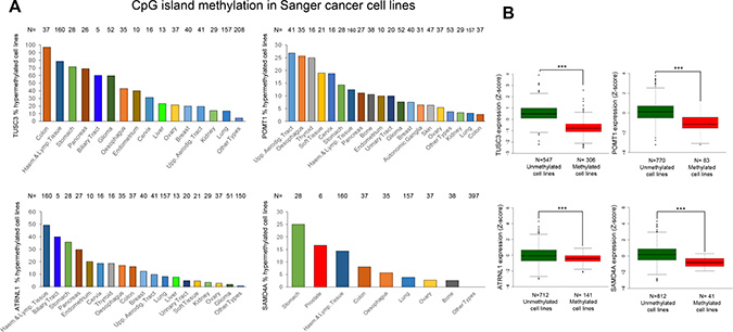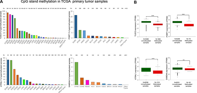 Figure 5: Hypermethylation profiles for the circRNA host genes in primary tumors and their association with transcript down-regulation. (A) Percentage of TUSC3, ATRNL1, POMT1 and SAMD4A promoter CpG island hypermethylated cases in the TCGA panel of primary tumors by tissue type. Barr codes: Adrenocortical carcinoma (ACC), Bladder urothelial carcinoma (BLCA), Breast invasive carcinoma (BRCA), Cervical and endocervical cancers (CESC), Cholangiocarcinoma (CHOL), Colon adenocarcinoma (COAD), Lymphoid Neoplasm Diffuse Large B-cell Lymphoma (DLBC), Esophageal carcinoma (ESCA), FFPE Pilot Phase II (FPPP), Glioblastoma multiforme (GBM), Glioma (GBM/LGG), Head and Neck squamous cell carcinoma (HNSC), Kidney Chromophobe (KICH), Kidney renal clear cell carcinoma (KIRC), Kidney renal papillary cell carcinoma (KIRP), Acute Myeloid Leukemia (LAML), Brain Lower Grade Glioma (LGG), Liver hepatocellular carcinoma (LIHC), Lung adenocarcinoma (LUAD), Lung squamous cell carcinoma (LUSC), Mesothelioma (MESO), Ovarian serous cystadenocarcinoma (OV), Pancreatic adenocarcinoma (PAAD), Pheochromocytoma and Paraganglioma (PCPG), Prostate adenocarcinoma (PRAD), Rectum adenocarcinoma (READ), Sarcoma (SARC), Skin Cutaneous Melanoma (SKCM), Stomach adenocarcinoma (STAD), Testicular Germ Cell Tumors (TGCT), Thyroid carcinoma (THCA), Thymoma (THYM), Uterine Corpus Endometrial Carcinoma (UCEC), Uterine Carcinosarcoma (UCS) and Uveal Melanoma (UVM). (B) Promoter CpG island hypermethylation of the genes studied is significantly associated with downregulation of the corresponding transcript in the TCGA panel of primary tumors. The box plots display the distribution of the expression values with the central solid line representing the median and the limits of the box, the upper and lower quartiles. The whiskers represent the minimum and maximum values excluding outliers (<1.5 × the interquartile range).
