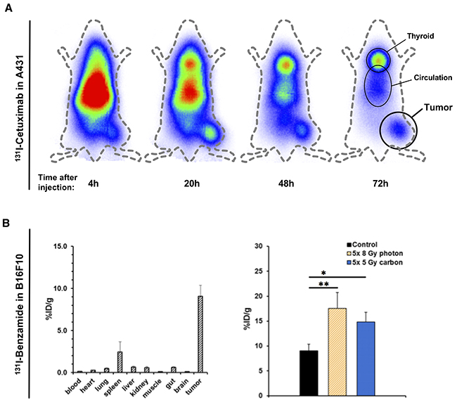 Figure 1: Effect of irradiation on tumor uptake of Iodine-labelled Cetuximab and Benzamide. (A) An A431-bearing nude mouse was injected with 131I-labeled intravenously and radioactivity distribution assessed over time using a gamma camera. (B) In vivo biodistribution of 131I-Benzamide was assessed 24h after intravenous injection in untreated B16F10-bearing mice (left). To analyze the effect of prior irradiation on tracer uptake animals underwent EBRT first and tracers were injected on the third day after the last fraction (right). EBRT-doses were 5x 8 Gy photon or 5 Gy carbon daily. Again, organ distribution was measured 24h after tracer injection. Data points indicate mean ± SEM *: p-value < 0.05, **: p-value < 0.01.
