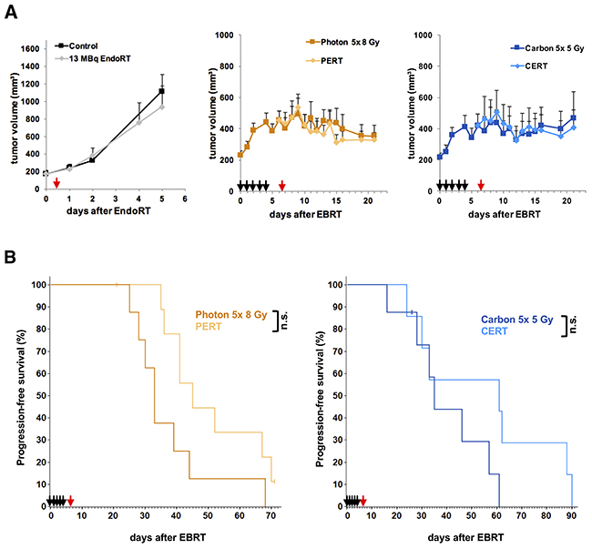 The efficacy of a sequential combined therapy with endoradiotherapy and photon-EBRT (PERT) or carbon ion-EBRT (CERT) was assessed by following the same treatment schedule as for biodistribution experiments.