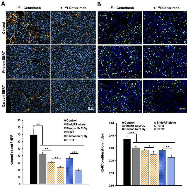Figure 4: Reduced tumor proliferation and microvascular density after combined EBRT and 131I-Cetuximab endoradiotherapy. Immunohistochemistry of tumor sections one week after EBRT or 5 days after endoradiotherapy. (A) Microvessel density was analyzed by immunofluorescent staining for endothelial CD31 (red). DAPI was applied as nuclear co-staining (blue). The number of vessels per high-power field on each section was counted automatically. (B) Proliferation index of A431 tumors under therapy was assessed by staining tumor sections for Ki-67 (green) and using DAPI as nuclear co-staining (blue). Ki-67 positive cells per high-power field were counted automatically and proliferation indices were calculated. Data points indicate mean ± SEM. *: p-value < 0.05, **: p-value < 0.01.