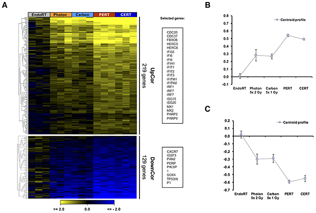 To investigate tumor therapy responses on molecular level, genome-wide transcriptional analysis was performed. Hierarchical clustering using euclidian distance and average linkage analysis of 500 most significantly regulated genes (ANOVA, p<0.01) in A431 model across all therapy modalities revealed a gradual expression pattern from EndoRT to EBRT and C/PERT as a predominant profile (Supplementary Figure 2). Next, we searched for genes demonstrating this gradual profile using a supervised approach, i.e. expression pattern of all genes was correlated against the pre-defined template with a gradual up-/down regulation profile (Pavlidis Template Matching, PTM). Of the 26307 transcripts analyzed in A431, 219 were gradually upregulated (UpCor) and 129 downregulated (DownCor) with a correlation coefficient of r ≥ 0.8 (p < 0.001 Figure 5). Less stringent cut-off criteria (r ≥ 0.7, p < 0.01) resulted into 658 UpCor and 444 DownCor transcripts (Supplementary Figure 3).