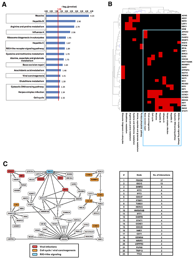 We then searched for protein-protein interactions and gene-regulatory networks among correlating genes utilizing NCBI human protein interaction database. Within the UpCor gene set, six gene-regulatory networks consisting of two or more nodes were identified. The largest network consisted of 57 nodes without interpolation, i.e., 26% of all UpCor transcripts were directly interconnected by known interactions (p < 0.005). The highest-ranking hub-node was F-box only protein 6 (FBXO6), a member of ubiquitin protein ligase complex with 17 direct neighbors within this network. The second largest hub node was Interferon-stimulated gene 15 (ISG15), a central player of type I interferon response [39, 40] and member of the RIG-I-like receptor signaling pathway which was also found to be enriched in the gene set enrichment analysis (Figure 6A and 6B). Other members of the network also reappeared in the gene set enrichment analysis as members of pathways associated with viral infections (DDX58, IFIT1, IRF1, MX1, STAT1) or viral carcinogenesis and cell cycle (CCND1, CCND3, CCNE1, CDC20, E2F2, RANBP1).