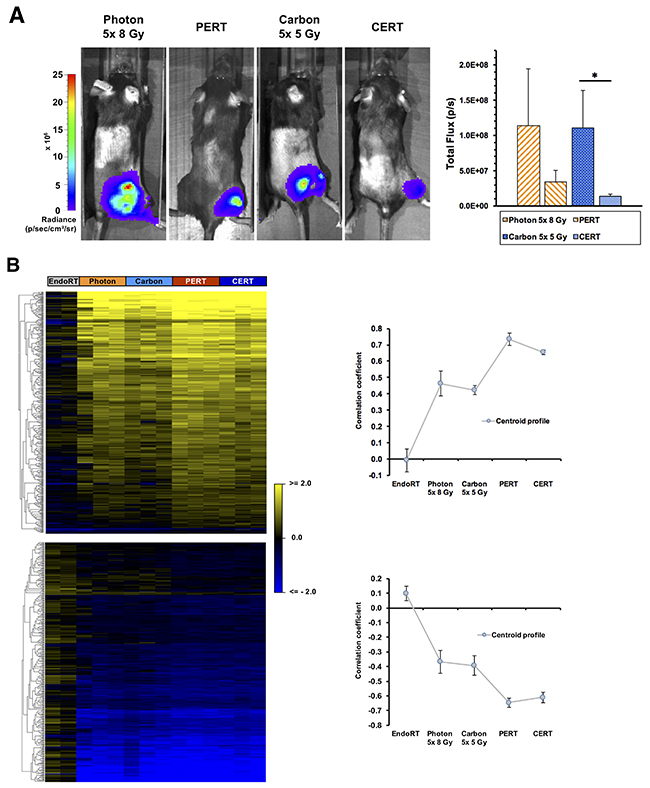 The B16F10 tumor cells used in this model are stably transduced with lentiviral vector and selected for high luciferase expression allowing bioluminescence imaging (Figure 7A). Bioluminescence imaging 5 weeks after the beginning of treatment revealed significantly lowered luciferase activity in CERT group compared to carbon-EBRT alone by 88% (p < 0.05). A trend towards lowered luciferase activity of 70% was also observed in PERT compared to photon-EBRT but did not reach statistical significance (p = 0.2).
