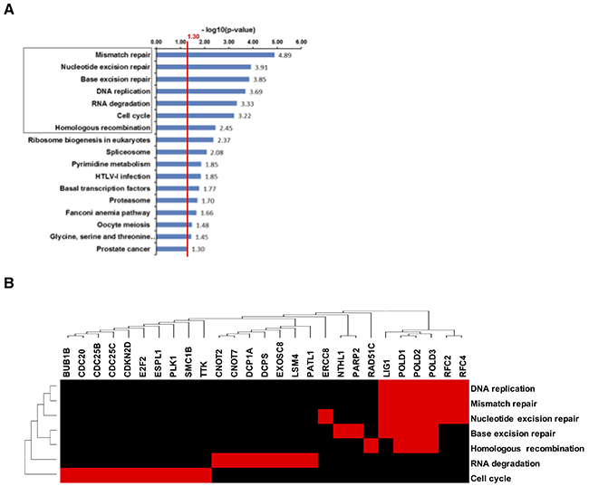 Figure 8: Down-regulation of genes related to DNA-damage response in B16F10 tumors after dual therapy. (A) KEGG-pathways were searched for enrichment of DownCor genes at the level of r ≥ 0.7 (p < 0.01). All significantly enriched KEGG-pathways are presented here. The red line indicates the cut-off for statistical significance for pathway enrichment to the level of p < 0.05. A population map highlights clusters of upregulated genes that the enriched KEGG-pathways have in common (B).
