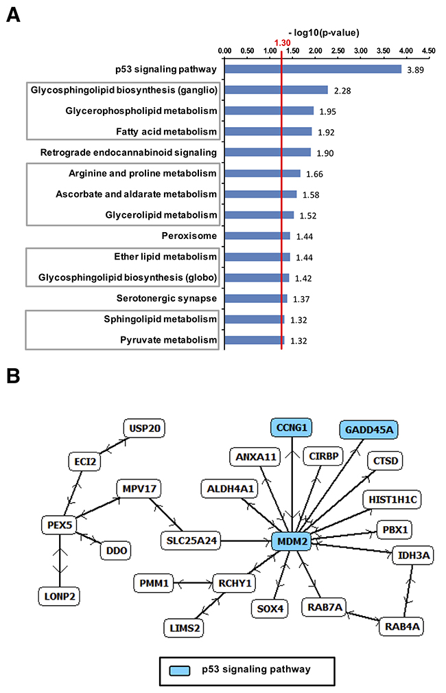 Figure 9: Upregulated genes in B16F10-tumors after dual treatment. (A) Pathway enrichment by UpCor genes (r ≥ 0.7, p < 0.01). The red line indicates the cut-off for statistical significance for pathway enrichment to the level of p < 0.05. The largest direct interaction network among the positively correlating genes was identified and again contained p53 associated genes (B).
