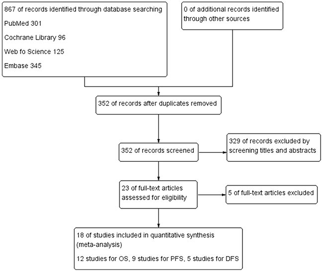 We searched PubMed, EMBASE, Cochrane Library and Web of Science to October, 2017. Our searching terms and procedures were as follows: (1) “VEGF”; (2) “ovarian cancer” OR “ovarian carcinoma” OR “ovarian tumor”; (3) “prognosis” OR “survival” OR “outcome”. Search strategy was (1) AND (2) AND (3). Other related terms, including references of some literatures we read, were also searched in English. Two assessors independently screened the titles and abstracts of each study. Once relevant studies became certain, the full texts were obtained for further evaluation.