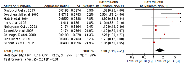 Table 2: The pooled results of subgroups for the association between high/positive expression of tissue VEGF and OS