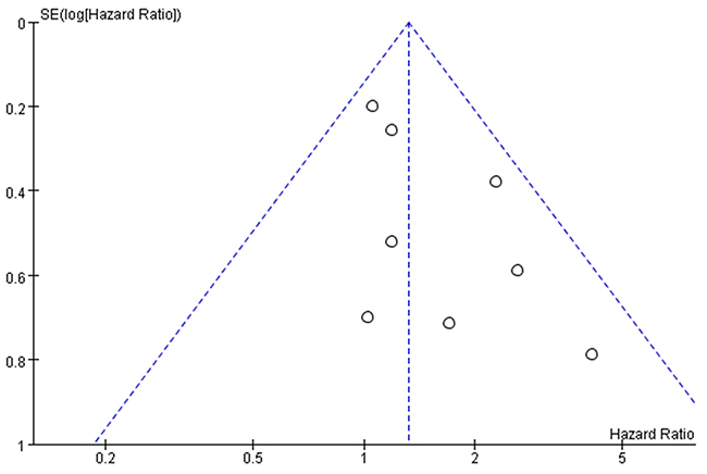 Funnel plots were conducted for assessing the publication bias of included literatures and we could roughly assess the publication bias by seeing whether their shapes were of any obvious asymmetry. The funnel plots showed no obvious evidence of publication bias with regard to the effects on OS (Figure 5).