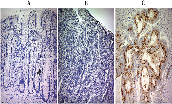 Figure 1: Prokineticin 2 (PROK2) protein expression in colorectal cancer (CRC) tumor tissues and adjacent normal tissues. (A) Representative image showing immunohistochemical analysis of PROK2 expression in adjacent normal tissue. Magnification, ×100. In all normal colonic epithelial samples, PROK2 protein immunoreactivity is absent. (B) Negative expression of PROK2 protein in CRC tissue. Magnification, ×100. (C) Positive expression of PROK2 protein in CRC tissue. Magnification, ×100. The PROK2 protein is strongly expressed and localized in the cytoplasm.