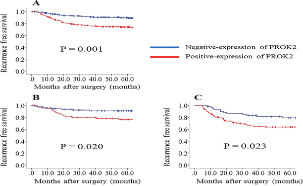 Our findings have several clinical applications. First, PROK2 expression in primary tumors may be helpful to classify patients who require intensive surveillance following surgery. In spite of the recommendation of adjuvant chemotherapy for stage III patients, recurrence rates have been reported to exceed 30%–40% [37, 38]. Additionally, the recurrence rates are high for stage II CRC at 20%–30% [39, 40]. One of the main problems is that surveillance protocols after curative surgery in various countries require a careful balance between the assessment of cost-conscious programs and possibility of cancer recurrence, which prevents standardization. Additionally, there is a lack of consensus on the type of imaging and frequency of imaging/colonoscopy surveillance, and the decisions are frequently left to the discretion of the surgeon or oncologist. The surveillance regimens are generally applied across all stages of the disease, and this may limit the early detection of recurrence. It would therefore be extremely beneficial to have suitable indicators to predict a high risk of recurrence and suggest a more intensive follow-up. Therefore, biomarkers such as PROK2 may help by providing an indication of the need for aggressive surveillance. Second, the results of this study indicated that PROK2 could be a potential biomarker for the selection of stage II patients who may benefit from adjuvant chemotherapy. One of the possible reasons for the lack of a meaningful benefit of adjuvant therapy in stage II patients is the inability of the current prognostication system to identify those who are truly at high risk. Actually, there is no consensus regarding whether postoperative chemotherapy should be administrated to all the patients with stage II cancers [41]. Hence, the incorporation of PROK2 expression in primary tumors into current standard prognostication systems may allow better risk stratification, with a possible improvement in survival. In our study, PROK2 expression in primary tumors was clearly a significant independent predictor for RFS.