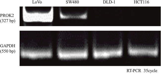 Total RNA was purified from CRC cell lines with ISOGEN II (Wako, Tokyo, Japan). Complementary DNA (cDNA) was synthesized from total RNA using the Prime Script RT reagent kit (Takara, Otsu, Japan) and the template for reverse transcription. Gene expression of PROK2 was analyzed using PCR. The primer sequences for PROK2 (GenBank accession no. NM_021935) gene-coding regions were as follows: 5′ primer, PROK2-AX: 5′-GGGGATCCATGAGGAGCCTGTGCTGCGCCCCA-3′; 3′ primer, PROK2-BX: 5′-GGGAATTCCTTTTGGGCTAAACAAATAAATCG-3′ [21]. GAPDH was used as an internal PCR control. The amplification conditions were as follows: 1) denaturation at 95°C for 1 min; 2) annealing at 55°C for 1.5 min; and 3) extension at 72°C for 2.5 min. Thirty-five cycles were performed using a thermal cycler (PTC-100, Programmable Thermal Controller; MJ Research Inc. Watertown, MA, USA). The result of amplification was analyzed using 2% agarose gel electrophoresis. Sequencing was performed on PCR products for clarifying the bands in RT-PCR analysis. Finally, the gels were stained with ethidium bromide to confirm the band of PROK2 mRNA. The reactive expression level of the target gene was standardized to that of the GAPDH internal control. All experiments were repeated three times to confirm reproducibility.