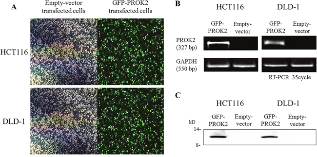 The pCMV6-Ac-GFP-PROK2 vector was transfected into CRC cell lines having low PROK2 mRNA expression (DLD-1 and HCT116). PROK2 mRNA overexpression was identified using fluorescence microscopy (Figure 4A) and RT-PCR (Figure 4B). Furthermore, western blot analysis demonstrated PROK2 protein overexpression in PROK2-transfected HCT116 and DLD-1 compared with pCMV6-Ac-empty vector-transfected cells (Figure 4C).