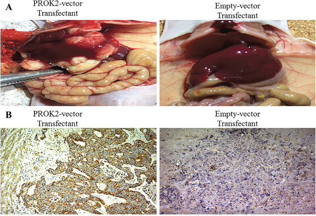 Figure 5: A nude mouse tumor xenograft model. (A) Representative images of the livers of nude mice injected with PROK2-transfected DLD-1 cells vs. empty vector-transfected DLD-1 cells. Left image is a typical view of the liver presenting with macroscopic metastasis. (B) Histologic evaluation of mouse metastatic liver nodules injected with PROK2-transfected DLD-1 cells (left image; magnification, ×100) vs. empty vector-transfected DLD-1 cells (right image; magnification, ×100) using immunohistochemical analysis with the anti-PROK2 antibody.