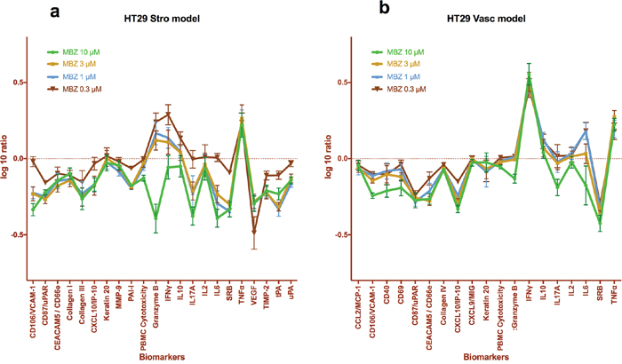 To determine the activity of MBZ in a complex primary culture human cell systems, we tested the compound at 0.3, 1, 3 and 10 μM in the BioMAP Oncology and Immune Oncology PanelsSystems (DiscoverX, CA, USA). These systems consist of complex co-cultures of PBMCs pooled from healthy donors with early passage human primary fibroblasts or endothelial cells, with or without a tumor cell line and are stimulated to recapitulate and model tumor-immune-stromal (StroHT29), or tumour-immune-vascular (VascHT29) microenvironments. The StroHT29 consists of primary fibroblasts co-cultured with the adenocarcinoma cell line HT-29 and human PBMCs stimulated via the T-cell receptor by SAg (superantigen) for 48 h. The VascHT29 system is identical except for primary human umbilical vein endothelial cells (HUVEC) replacing the fibroblasts.