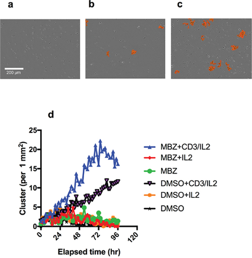 Figure 2: Clustering of PBMC cultures in response to anti-CD3/IL2 and MBZ. Photomicrographs shows the effect of CD3/IL2 (0.5/2.5 μM) alone (a) together with 1 μM MBZ (b) in comparison with a DMSO exposed control (c) on clustering assessed in the Incucyte Zoom. An orange mask was added to visualise the the criteria used by the Incucyte to define the clusters. In (d) the kinetics of clustering over time is shown. The experiment was repeated at least 3 times with similar results.