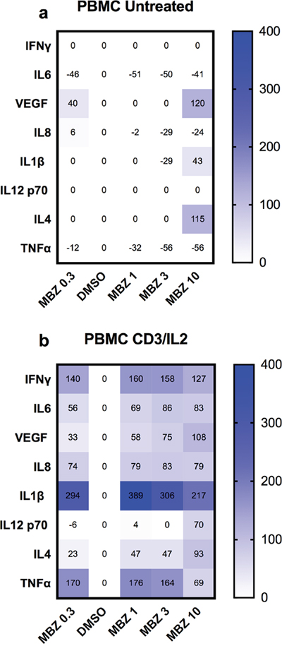 Figure 3: Cytokine release from PBMCs in response to 24 h exposure to the indicated concentrations of MBZ relative to DMSO control. The effect of increasing concentrations of MBZ on unexposed PBMCs (a) or those exposed to anti-CD3/IL2 (b) is shown using a multiplex kit from R&D. Results are presented as % over DMSO (0.1%) control. A value of zero includes data where both DMSO and MBZ treatment did not reach the lowest concentration of the standard curves. The experiment was repeated three times with similar results.