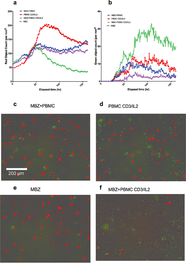 Figure 4: Co-culture of PBMCs and red fluorescence-labeled A549 lung cancer cells in medium containing caspase 3/7 probe (Cas3/7). The kinetics of changes in A549 cell survival (red object count) and apoptosis (green object count, cas3/7 positive cells) in response to anti-CD3/IL2 and MBZ is presented in panel (a and b), respectively. Representative photomicrographs for the different incubations after 1 week are shown in (c-f), as indicated. The difference in red object count measured as AUC between the MBZ+CD3/IL2 treatment group vs all other groups including MBZ without PBMC (see Table 1). This was also the case when comparing AUC of green object counts (caspase positive cells).