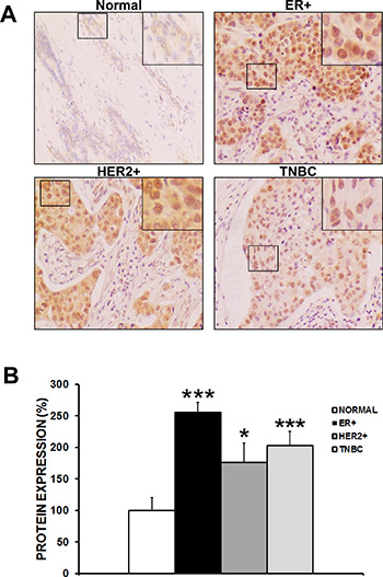 Figure 1: CAPER expression is induced in human breast cancer specimens. (A) Immunohistochemical analysis reveals upregulated nuclear CAPER expression in ER+, HER2+ and TNBC breast cancer specimens when compared to normal benign breast specimens. Brown staining corresponds to cells positive for 3,3′-Diaminobenzidine (DAB) staining and intensity is proportional to CAPER expression. Pictures were taken at 20× an EVOS microscope. (B) Semiquantitative analyses as assessed by histoscore (H-score) method show a significant increase in nuclear CAPER protein levels in ER+ (2.5-fold, p < 0.001, n = 192), HER2+ (1.7-fold, p < 0.05, n = 48) and TN breast cancer patients (2-fold, p < 0.001, n = 116) as compared to normal breast tissues (n = 94).