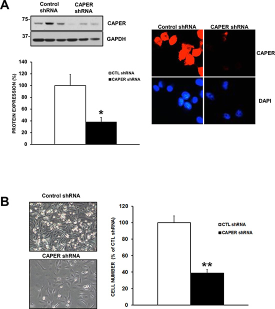 Figure 5: Knockdown of CAPER expression with a different shRNA sequence also diminishes cell number. (A) Western blot analysis demonstrates that MDA-MB-231 cells stably expressing CAPER shRNA #69 (TRCN0000021769) also demonstrate reduced CAPER protein expression. Indeed, quantitation of CAPER knockdown through densitometry using Image J (CAPER/GAPDH) revealed a significant downregulation of CAPER protein levels (~2.5-fold, p < 0.05, n = 3) vs CTL shRNA. As seen CAPER expression was restricted to the nucleus (upper left panel) and significantly decreased following CAPER shRNA (right upper panel). Nuclear counterstain with DAPI illustrates nuclear localization in MDA-MB-231 cells (red; CAPER immunostaining, blue; nuclear DAPI staining). Immunofluorescence pictures were acquired on EVOS-FL using a 40× objective. (B) Phase contrast pictures depict a visual difference at 7-day time point following equal plating in MDA-MB-231 expressing CAPER shRNAs (pictures acquired using a 10× objective, Olympus). Quantitatively, total cell count of adherent cells clearly demonstrates that knockdown of CAPER significantly reduced cell number (~2.5 fold, p < 0.01, n = 3) as compared to their control counterpart.