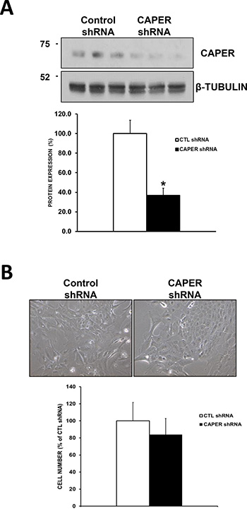 Figure 6: Knockdown of CAPER in a non-tumorigenic cell line MCF-10A does not affect their growth. (A) Western blot analysis shows reduced CAPER protein expression levels in MCF-10A cells expressing CAPER shRNAs compared to CTL shRNAs. Beta-tubulin is shown as loading control. Quantitation of CAPER knockdown was performed through densitometry using Image J and revealed a significant downregulation of CAPER protein levels in MCF-10A cell line (2.7-fold, p < 0.05, n = 3). (B) Phase contrast pictures depict no visual difference in adherent cell numbers at 7-day time point following equal plating in MCF-10A cells expressing either CTL or CAPER shRNAs (pictures acquired using a 10× objective, Olympus). Quantitatively, total cell count of adherent cells clearly demonstrates that knockdown of CAPER did not significantly affect cell number in MCF-10A (p = NS, n = 4) vs CTL shRNA.