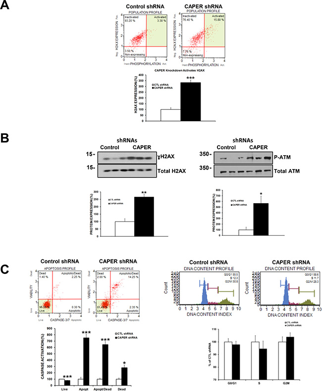 Figure 7: Knockdown of CAPER induces DSB proteins ATM and H2AX and leads to apoptosis in MDA-MB-231 cells. (A) H2AX phosphorylation on ser139 is significantly increased (upper right quadrant population) in MDA-MB-231 cells after CAPER knockdown as represented by Muse Cell Analyzer plots (3-fold, p < 0.001, n = 3). (B) The increase in γH2AX was also validated through western blot analysis (2.5-fold, p < 0.01, n = 3). ATM phosphorylation on serine1981 is significantly upregulated after knockdown of CAPER expression (5-fold, p < 0.05, n = 3). (C) CAPER knockdown resulted in an increased level of caspase-3/7 activation through decreasing live cells (1.2-fold, p < 0.001, n = 3), while increasing apoptotic (7.5-fold, p < 0.001, n = 3), apoptotic/dead (6.5-fold, p < 0.001, n = 3), and dead (3-fold, p < 0.05, n = 3) cell populations. Interestingly, MDA-MB-231 cells expressing CAPER knockdown displayed no significant changes in any of the phases of the cell cycle (p = NS, n = 8, for G1, S and G2/M phases) compared to CTL shRNA (Figure 7C right panels).