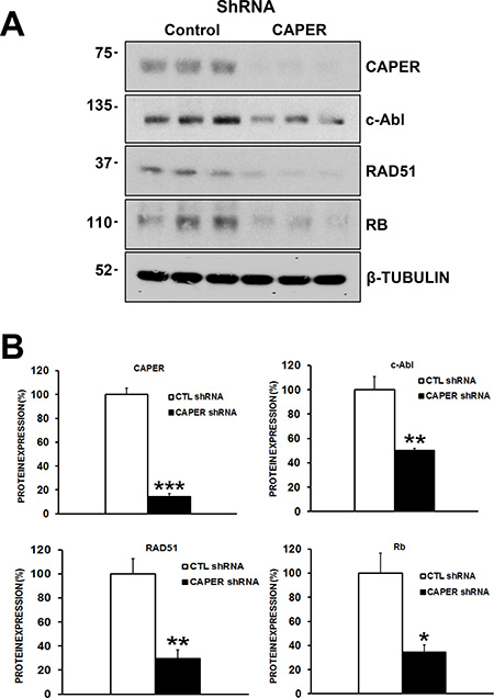 Figure 8: CAPER Knockdown decreases the levels of c-Abl, RAD51 and retinoblastoma proteins, essential proteins involved in homologous recombination repair of DNA in MDA-MB-231 cells. (A) Western blot analysis shows the effects of CAPER knockdown on DNA repair protein expression levels. (B) Quantitation was performed through densitometry using Image J which revealed that down-regulation of CAPER (7-fold, p < 0.001, n = 3) following lentiviral infection caused significant changes in c-Abl (p < 0.01, 2-fold, n = 3), RAD51 (p < 0.01, 2.5-fold, n = 3) and Rb (p < 0.05, 3-fold, n = 3) protein levels in MDA-MB-231 cells.