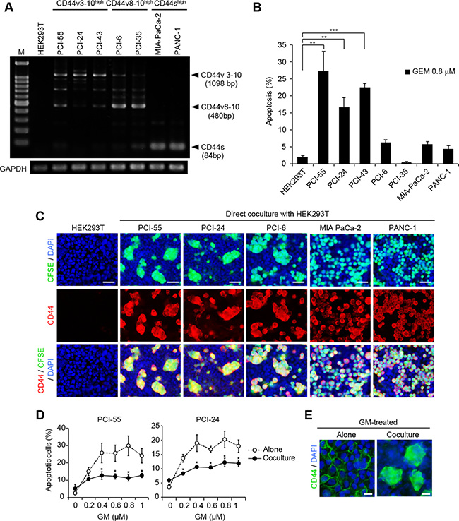 Figure 1: Direct coculture with HEK293T cells induces Ad-MCAs in CD44vhigh/CD44slow epithelial PDAC cells. (A) RT-PCR analysis of CD44 variant isoform expression in seven CD44+ PDAC cell lines. (B) Percentage of apoptotic PDAC cells induced by treatment with GM. PDAC cell lines were cultured in the presence of 0.8 μM GM for 48 h. Apoptotic PDAC cells were evaluated by the percentage of sub G0/G1 phase cells by flow cytometry. (C) Ad-MCA formation by CD44vhigh/CD44slow epithelial PDAC cells. (D) Percentage of apoptotic cells in PCI-55 and PCI-24 cells treated with GM for 48 h. (E) Ad-MCA formation by PCI-55 cells is not affected by treatment with 0.8 μM GM (right). The data are presented as the mean values of three independent experiments. *P < 0.05, **P < 0.01, ***P < 0.001. Bars: 50 μm (C), 25 μm (E).