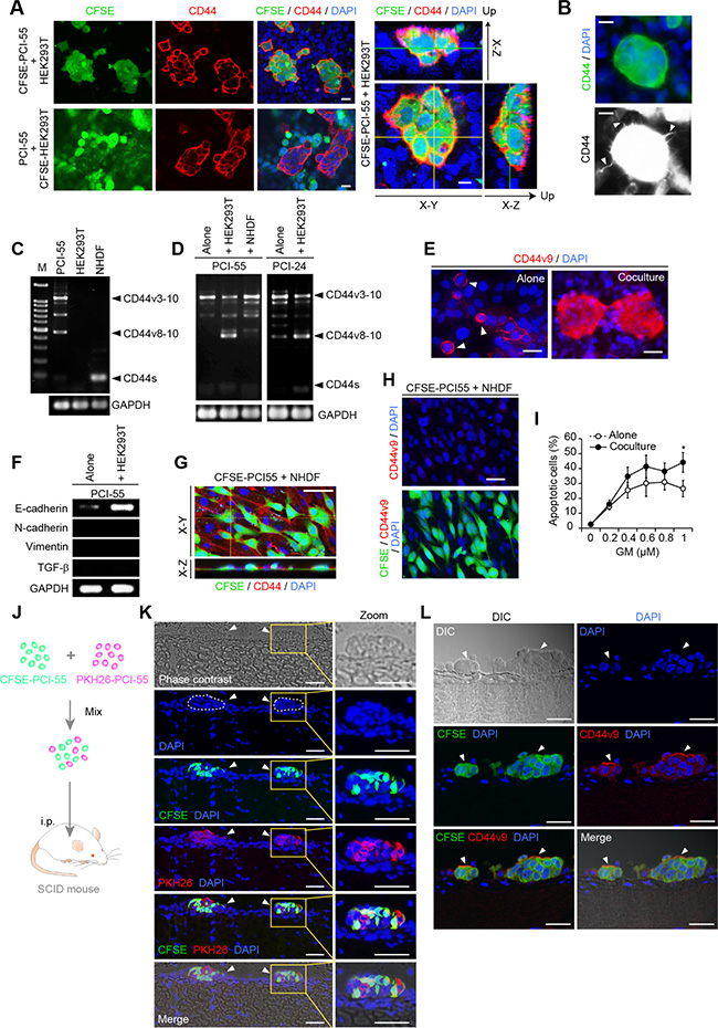 Figure 2: Ad-MCA-forming CD44v3-10high/CD44slow PDAC cells increase CD44v8-10 expression. (A) Pronounced staining for CD44 was observed on the surface of Ad-MCAs formed by PCI-55 cells on a monolayer of HEK293T cells. Trans-axial images (left panels) and three-dimensional images (right panels) were captured by confocal microscopy. (B) Filopodia on the surface of MCA. (C, D) RT-PCR analysis of CD44 variant isoform mRNAs. PDAC cells were sorted after culture without feeder cells or coculture with HEK293T or NHDFs. Alone (C) and coculture (D). (E) CD44v9 expression in PCI-55 cells cultured alone or cocultured with HEK293T cells. (F) RT-PCR analysis of expression of E-cadherin, N-cadherin, vimentin, and TGF-β. PDAC cells were sorted after culture without feeder cells or coculture with HEK293T cells. (G) Three-dimensional analysis of PCI-55 cells cocultured with NHDFs. (H) Absence of CD44v9 expression in CFSE-labeled PCI-55 cells cocultured with NHDFs. (I) Percentage of apoptotic PDAC cells cocultured with NHDFs in the presence of GM (right panels). The data are presented as the mean values of three independent experiments. *P<0.05. Bars: 25 μm. (J–L) CD44slow PDAC cells form Ad-MCAs through peritoneal dissemination in SCID mice. A mouse model for peritoneal dissemination (J). A mixture of CFSE- or PKH24-labeled PCI-55 cells (1 × 106 in total) were injected intraperitoneally into SCID mice. Peritonea were harvested from the mice after 3 days. Spherical microtumors composed of a mixture of green and red fluorescent cells were frequently observed on peritoneum (K, arrowheads). Immunofluorescent staining for CD44v9 (L). Peritonea were harvested at day 1 after injection of CFSE-labeled PCI-55 cells. Arrowheads, microtumors by PCI-55 cells. Bars: 200 μm (K), 100 μm (L).