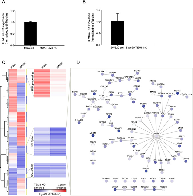 Figure 2: The expression of cell cycle-related genes is enriched in TEM8 KO cancer cells. (A and B) Real-time quantitative PCR evaluating the mRNA expression levels of TEM8 confirms knockdown in MDA TEM8 KO and SW620 TEM8 KO cell lines compared to their control (ctrl) cell lines, MDA and SW620 respectively. n = 3 independent experiments, Statistical significance was assessed by One-way ANOVA, p < 0.0001. (C) Clustering analysis of gene expression in MDA and SW620 TEM8 KO cell lines (n = 3 independent experiments). The average of values for probes corresponding to one gene was used in the comparison. Proteins involved in blocking cell cycle and division are highlighted. (D) Network analysis of proteins interacting in the cell cycle cluster where similar in both MDA and SW620 cell lines. Node color here depicts values from SW620 control and SW620 TEM8 KO cell lines.