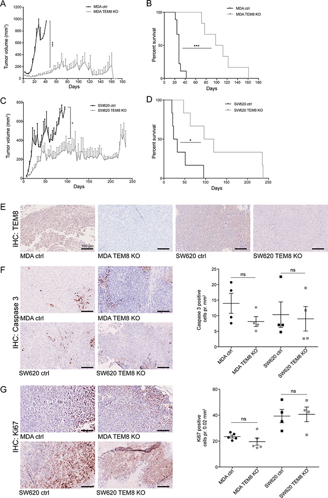 Figure 3: The knockout of TEM8 inhibits breast and colorectal cancer growth and prolongs survival in vivo. (A) Average volume of MDA orthotopic tumors over time. Statistical significance was assessed by Unpaired two-tailed t-test. The graph represents two independent experiments of n = 4 and n = 5 tumors per group, p = 0.0002. (B) MDA survival curves. Statistical significance was assessed by Log rank test, p ≤ 0.0001. (C) Average volume of SW620 subcutaneous tumors over time. Statistical significance was assessed by Unpaired two-tailed t-test, two independent experiments of n = 6 tumors per group, p = 0.0382, (D) SW620 survival curves. Statistical significance was assessed by Log rank test, two independent experiments of n = 3 mice per group, p = 0.0108. (E) TEM8 expression in TEM8 KO and control tumors was assessed by IHC. (F) IHC of cleaved caspase 3 in TEM8 KO and control tumors (left). Quantification of cleaved caspase 3 expression (right). Statistical significance was assessed by Unpaired two-tailed t-test n = 4 tumors, not significant (ns). (G) IHC of Ki67 expression in TEM8 KO and control tumors (left). Quantification of Ki67 expression (right). Statistical significance was assessed by Unpaired two-tailed t-test, n = 4 tumors, ns. (A+C) Data represented as mean + SEM. (F–G) Data represented as mean ± SEM.