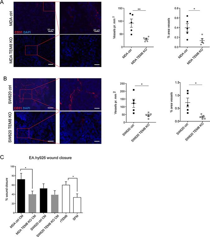 Figure 4: TEM8 promotes vessel formation in breast and colorectal tumors. (A) Left, representative micrographs and corresponding magnified areas showing CD31 (red) and cell nuclei (DAPI, blue) in orthotopic MDA tumors. Rigth, quantification of vessel number and vessel area. Statistical significance was assessed by unpaired two tailed t-test, n = 5 mice, vessel number: p = 0.0054, area: p = 0.0225. (B) Left, representative micrographs and corresponding magnified areas showing CD31 (red) and cell nuclei (DAPI, blue) in subcutaneous SW620 tumors. Right, quantification of vessel number and vessel area. Statistical significance was assessed by unpaired two tailed t-test, n = 5 mice, vessel number: p = 0.0222, area: p = 0.0130. (C) Percent wound closure in endothelial EA.hy926 cells after eleven hours of migration treated with CM from TEM8 control or TEM8 KO cells, or recombinant TEM8 (rTEM8) as indicated. Serum free medium (SFM) was included as a negative control. Statistical significance was assessed by unpaired two-tailed t-test between MDA ctrl and TEM8 KO CM (p = 0.454) and unpaired two-tailed t-test between rTEM8 and SFM treated EA.hy926 cells (TEM8, p = 0.0261), n = 3 independent experiments.