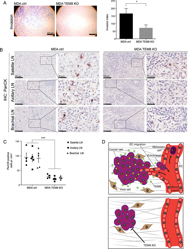 As angiogenesis is important in the invasion-metastasis cascade, and disseminating tumor cells typically escape the primary tumor via blood and lymphatic vessels [30], the anti-angiogenic effects of the TEM8 KO seen in breast and CRC tumors could have an effect on metastasis. We first used a Matrigel invasion assay to assess the importance of TEM8 for the invasive capacity of MDA cells and found that MDA TEM8 KO cells invaded significantly less compared to MDA control cells (Figure 5A). These in vitro results suggest that TEM8 may affect the metastatic burden of breast cancer in vivo.
