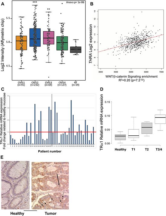 Figure 1: Correlation between TRα1 and Wnt in human colorectal cancer samples. (A) THRA gene expression levels was evaluated in the GSE39582 dataset [52] and presented as boxplots according to the four-subtypes of the consensus molecular classification of CRC [13]. Note the dispersed expression of THRA in the different groups compared with the healthy mucosae (NT). **P = 0.0021 and ***P = 0.00028 by ANOVA followed by Tukey’s post hoc test. (B) Positive correlation between THRA expression and the Wnt signaling pathway in human CRC. THRA expression values and Wnt/β-catenin signaling enrichment were analyzed in CRC using the TCGA dataset. The graph shows a highly significant (P-value, 7.2 × 10–32) direct correlation between THRA expression levels and Wnt activity. (C) Analysis of TRα1 mRNA expression in cohorts of tumors. Histogram displays TRα1 mRNA expression in each tumor represented as fold change relative to the healthy mucosa of the same patient (expression value in healthy mucosa = 1). The red line delineates over- or unchanged/low-TRα1-expressing tumors; the dotted black line distinguishes the two cohorts analyzed. (D) Analysis of TRα1 mRNA expression in healthy mucosae and tumors illustrated in (C) organized according to the increase in tumor stage (from T1 to T4) as indicated. Boxplots show the distribution of data and the mean (black thick line). (E) Immunohistochemical analysis of TRα1 expression in healthy mucosa and in cancer. TRα1 appears to be clearly expressed in the nuclei of some epithelial cells in cancer but is not-detectable in normal tissue. Bar, 5 μm.