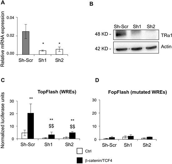 Figure 2: TRα1 enhances b-catenin/TCF4 activity in colorectal cancer cells. (A, B) Generation of TRα1-depleted Caco2 cell lines. Knock-down efficiency was assessed by comparing TRα1 mRNA by RT-qPCR (A) or protein by IB (B). Two independent shRNA sequences targeting TRα1 (efficiency ~80%) and a scrambled-Sh (Sh-Scr) were used in all of the experiments. Histogram represents the mean ± SD (N = 6) from one of three independent experiments. *P < 0.05 compared with Sh-Scr by Student's T-test. (C, D) Depletion of TRα1 decreases canonical Wnt signaling activity. Bar graphs display quantification of luciferase activity in Caco2 cell lines generated in (A) after transfection with the TopFlash vector (C) or the negative control FopFlash vector (D) to monitor Wnt activity by using the Dual-Luciferase Reporter Assay System. Caco2 cells were maintained in culture medium containing physiological concentrations of T3 in the absence (Ctrl) or presence of co-transfected β-catenin/TCF4 complex. Histograms represent the mean ± SD (N = 6) from one of three independent experiments. **P < 0.01 compared with the control condition in the same cell line; $$P < 0.01 compared with the β-catenin/TCF4 condition in Sh-Scr cells.