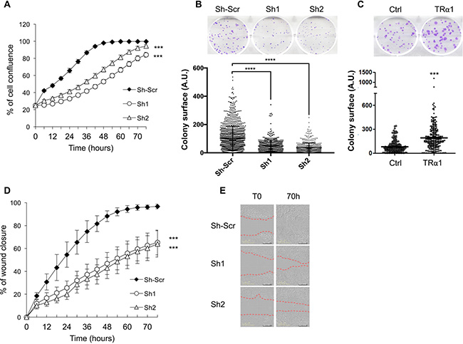 Figure 3: TRα1-dependent cell growth and migration in colorectal cancer cells. (A) Depletion of TRα1 inhibits cell proliferation. Caco2 cell lines were analyzed for their ability to proliferate during 70 h in culture medium supplemented with 10% FBS. The confluence indexes (y-axis) of the cell lines are displayed as line graphs. Depletion of TRα1 significantly delays cell proliferation. Histogram represents the mean ± SEM (N = 10) from one of three independent experiments. (B) Depletion of TRα1 inhibits anchorage-dependent cell growth. TRα1-depleted Caco2 cells were analyzed for their ability to form adherent colonies on plastic plates over the course of 2 weeks prior to fixation and staining with crystal violet. The upper panel shows a photograph of the crystal violet-stained 6-well plates. The number of colonies was counted by ImageJ (colony counter), and plot graphs (lower panel) displaying the size (area) of colonies formed (y-axis) for each cell line. (C) Increased expression of TRα1 potentiates anchorage-dependent cell growth. TRα1-engineered Caco2 cells were analyzed for their ability to form adherent colonies on plastic plates during 2 weeks prior to fixation and staining with crystal violet. In the upper panel, photograph of the crystal violet-stained 6-well plate is displayed. The number of colonies was counted by ImageJ (colony counter) and the plot shown in the lower panel displays the size (area) of colonies formed (y axis) for each cell line. ***P < 0.001 compared with the control cell line by Student’s T-test. (D, E) Depletion of TRα1 inhibits 2-D cell migration. Confluent monolayers of Caco2 cells were scratch-wounded and incubated for 70 h in culture medium supplemented with 10% FBS, and wound closure was monitored and quantified. In panel D, confluence indexes (y-axis) in cell lines are displayed as line graphs. Note that depletion of TRα1 significantly delays wound closure. Histograms represent mean ± SEM (N = 10) from one of three independent experiments, each conducted in 10 replicates. Panel E shows representative pictures of different cell lines taken at T0 or T70. Red dashed lines in E delineate the wounded surface (T0) and the surface still depleted of cells (T70). ***P < 0.001 and ****P < 0.0001 by Student’s T-test. *** in A and D applies to each time-point.