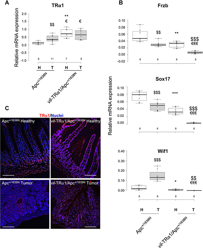 Figure 4: Inverse correlation between TRα1 and Wnt antagonists. (A, B) Analysis of TRα1 mRNA expression (A) and Frzb, Sox17 and Wif1 mRNA expression (B) in healthy mucosae (H) and tumors (T) from animals of the indicated genotypes. The number of samples analyzed is indicated on the X axis. Boxplots illustrate the distribution of data and the mean (black thick line). Note that Frzb, Sox17 and Wif1 mRNA expression are down-regulated in vil-TRα1/Apc compared to Apc tumors, thus validating the microarray data. *P < 0.05 and **0.01, compared with healthy Apc mucosae; $P < 0.05 and $$P < 0.01, compared with tumor of the same genotype; €P < 0.05 and €€P < 0.01, compared with Apc tumors by Student’s T-test. (C) TRα1 immunolabeling of intestinal sections (healthy mucosa and tumor) from Apc and vil-TRα1/Apc mice as indicated. The images, which are representative of at least three tumors per genotype, show merged nuclear staining (blue) and TRα1 staining (red). Bars, 10 μm.