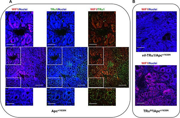 Figure 5: Analysis of TRα1 and WIF1 expression domains. Immunolabeling of intestinal tumor sections from Apc (A) and vil-TRα1/Apc or TRα0/0/Apc mice (B). The images, which are representative of at least three tumors per genotype, show nuclear staining (blue), protein-specific staining (red or green) and merged images, as indicated. In tumors from Apc mice, TRα1 is heterogeneously expressed, and WIF1 is essentially expressed in areas showing weak TRα1 staining. Bars: A, low magnifications 10 μm, high magnifications 2.5 μm; B, 5 μm.