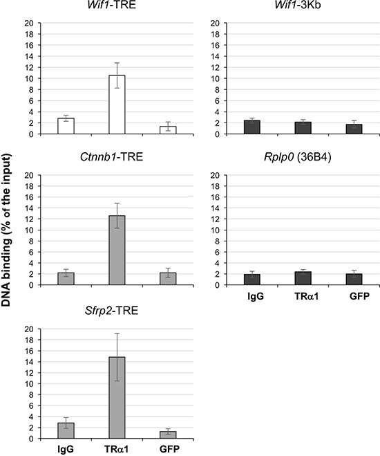 Taken together, these results support the model in which TRα1 enhances Wnt signaling at least in part by down-regulating the expression of Wnt antagonists in vivo. To decipher the mechanism by which TRα1 is acting on their expression, we investigated the presence of a TRE in the promoter of the Wnt antagonists in order to elucidate whether TRα1 may bind and eventually regulate their transcription. Using an in silico approach (http://www.nubiscan.unibas.ch/), we excluded the presence of putative TREs in the Frzb and Sox17 genes, while we located a putative TRE in the promoter of Wif1, organized as a canonical DR4 repeat [9], at the position -3555 from the transcription start site (Supplementary Figure 8A and 8B). To check whether TRα1 binds the Wif1-TRE in vivo, we used a chromatin immunoprecipitation (ChIP) approach. The ChIP assay was performed on fresh epithelial preparations from WT mouse intestine using anti-TRα1, anti-GFP or rabbit IgG (negative controls). As shown in Figure 6 and Supplementary Figure 9, TRα1, but not GFP, bound to the Wif1 promoter region containing the Wif1-TRE site. No binding was observed upstream (up to 3 Kb) of the Wif1-TRE site. The percentage of TRα1 binding in vivo was similar to that previously described for Sfrp2-TRE [27] or Ctnnb1-TRE [28] (Figure 6); no specific binding was detected at the Rplp0 (36B4) promoter (Figure 6).