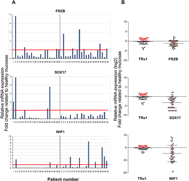 Figure 7: Correlation between TRα1 and Wnt antagonists in human colorectal cancer samples. (A) Analysis of FRZB, SOX17 and WIF1 mRNA expression in cohorts of tumors. Histograms display the mRNA expression in each tumor represented as the fold change relative to the expression in the healthy mucosa of the same patient (expression value in healthy mucosa = 1). The red line delineates high- or unchanged/low-mRNA-expressing tumors; the dotted black line distinguishes the two cohorts analyzed. (B) Relative mRNA expression of TRα1 and FRZB (upper panel), SOX17 (middle panel) and WIF1 (lower panel) in each tumor, expressed as fold change relative to the healthy mucosa of the same patient. The thick black lanes indicate the means. Red and black dots show expression values of high and unchanged/low TRα1 expressing-tumors, respectively. FRZB/SOX17/WIF1 mRNA expression are represented by red and black circles, corresponding respectively to high- or low-TRα1-expressing tumors. Note that most of the red circles are located well above the black dotted line, which defines tumors with unchanged expression levels.