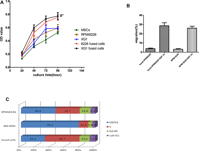 Figure 2: Effects of cell fusion on cell behaviors. Fusion with BM-MSCs not only enhanced in growth and migration of the hybrid cells, but also promoted the cells into cell cycle in vitro. In the meantime, the cell fusion has the ability to promote more hybrid cells into cells cycle. (A) Effects of cells fusion on proliferation of hybrid cells. (*p < 0.05, compared to those with MM cells; and #p < 0.01, compared to those with MSCs). (B) Effects of cell fusion on migration of hybrid cells in medium with or without SDF-1α (N: no statistic significance, p > 0.05). (C) Effects of cell fusion on cells cycle in vitro.