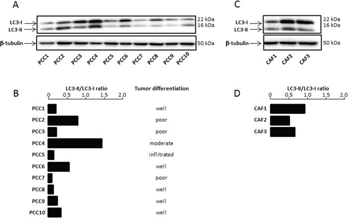 Figure 1: (A) Basal Autophagy was evaluated by proteolysis of LC3-II by western blot. (B) The bar graph indicates the ratio between LC3-II and LC3-I at basal state after β-tubulin normalization. Autophagy levels were estimated and compared with tumor grade differentiation. (C) Basal Autophagy was evaluated in three CAFs. (D) The bar graph indicates the ratio between LC3-II and LC3-I at basal state after β-tubulin normalization. Experiments were repeated at least 2 times.