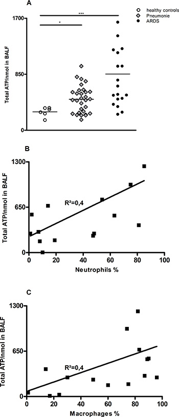 Figure 1: Increased ATP-Level in BALF of ARDS patients compared to healthy patients. ATP concentrations in BALF were measured using ATPlite assay. (A) Significant increase in ATP levels in BALF of patients with pneumonia and ARDS compared to healthy controls. (B and C) Correlation between neutrophils (A) or macrophages (B) in BALF in % value and ATP concentration.