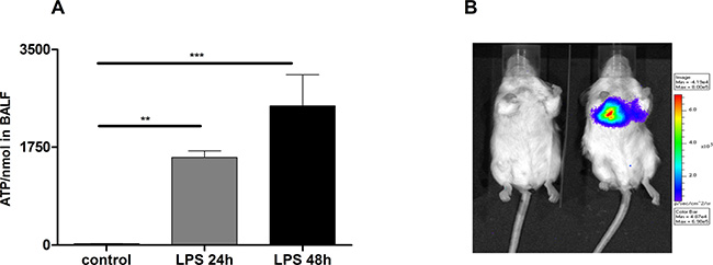 Figure 2: Increased ATP-Levels in the lungs of LPS treated mice. (A) Significant increase of ATP in BALF after 24 h and 48 h of LPS exposure compared to controls. Animals were exposed to LPS (300 μg/kg/i.t.) and after 24 h and 48 h animals were killed and the BALF was collected. Data are means ± SEM, n = 5–10, *p < 0.05; **p < 0.01; ***p < 0.001. (B) Strongly enhanced in vivo extracellular ATP release in LPS exposed animals compared to controls. In vivo bioluminescence imaging using the IVIS 100 system.