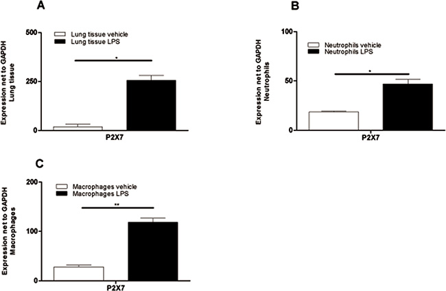 Figure 3: Significant upregulation of P2X7R-expression in lung tissue and BALF cells after LPS exposure. Animals received LPS and vehicle on day 0 and were killed 24 hours later. Lung tissue and BAL-cells were collected and RNA was isolated. Relative expression of the P2X7R compared with GAPDH was analyzed using quantitative RT-PCR. (A) P2X7R subtype expression in lung tissue of PBS-exposed or LPS-exposed animals. (B) Expression of P2X7R on pooled BALF neutrophils (n = 10 LPS animals and n = 20 PBS animals). (C) P2X7R Expression on pooled BAL macrophages (n = 10 LPS animals and n = 20 PBS animals). Data are means ± SEM, n = 10–20, *p < 0.05; **p < 0.01; ***p < 0.