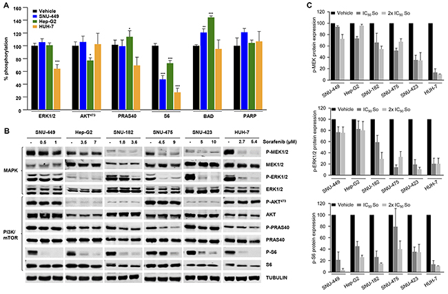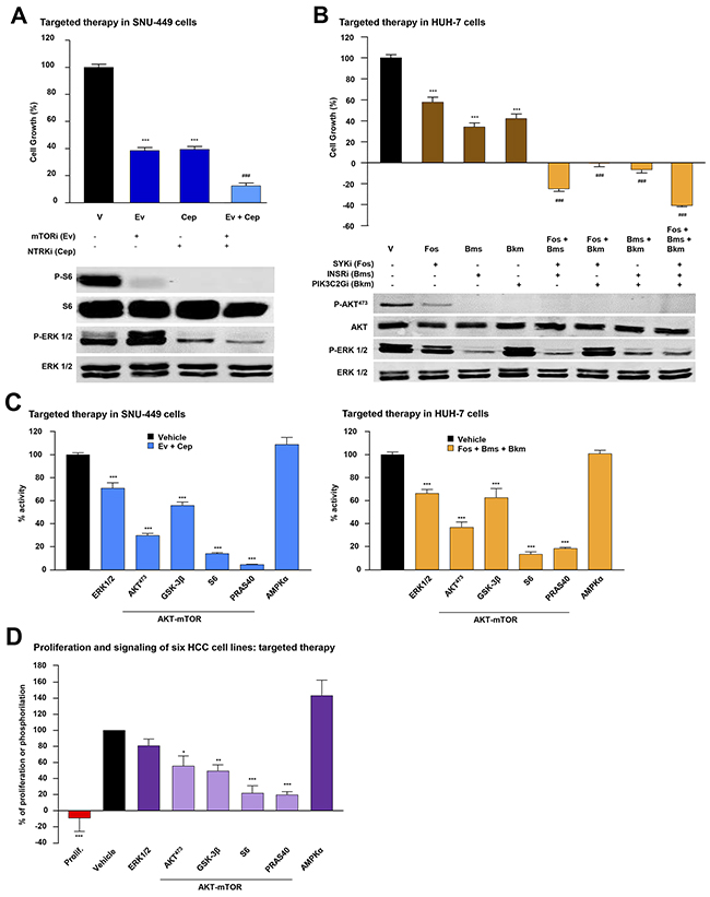 In light of our findings, it is conceivable that case-specific targeted therapies could increase the anti-HCC effects of sorafenib. To explore this possibility, we compared the mechanistic effects elicited by incubating SNU-449 and HUH-7 cells with IC50 concentrations of sorafenib plus cell-specific targeted therapies (see results from Hep-G2 cells in Supplementary Figure 4). As expected from our previous findings, these combinations most strongly inhibited specific signaling mechanisms like MAPK-ERK (P-ERK-1/2) and AKT/mTOR (P-AKT473, P-GSK-3B and P-PRAS40 and P-S6), which are known to play an important role in the biology of HCC (Figure 4A and Supplementary Table 5). We next examined our data by using an alternative approach to explore the biological and mechanistic effects of treatment with sorafenib and targeted therapy used alone or in combination in SNU-449 and HUH-7 cells. The combination of sorafenib with targeted drugs most strongly inhibited cell proliferation and DNA synthesis in HCC cells (Figures 4B-4E). Interestingly, the combination of sorafenib with targeted inhibitors caused synergistic effects over the proliferation of SNU-449 and HUH-7 cells, with combination indexes below 1 (Supplementary Figure 6). Moreover, this occurred in parallel with higher blockages of MAPK and AKT/mTOR signaling pathways as assessed by western blot using anti-P-ERK-1/2, anti-P-AKT473 and anti-P-PRAS40 antibodies (Figures 4B-4E). Similar results were also obtained in other HCC cell lines like Hep-G2, SNU-182, SNU-475 and SNU-423 (Supplementary Figures 4 and 5). Finally, we interchanged the targeted inhibitors plus sorafenib between SNU-449 and HUH-7 cells and analyzed the effects in cell proliferation. Our data show higher efficiency when inhibitors were used in the appropriate mutational background (compare Supplementary Figures 7A with 4D and Supplementary Figure 7B with 4B). It is therefore possible that, using our targeted approach, we could detect and target specific mechanisms, like for example AKT/mTOR, that when used in combination with sorafenib, could increase its anti-HCC activities.