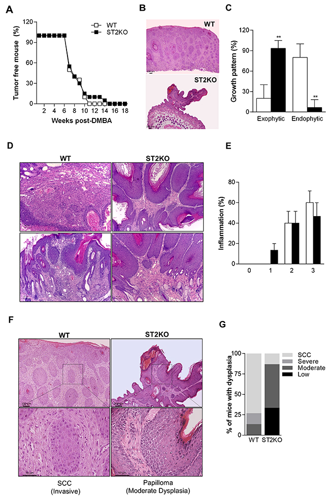To explore the role of IL-33 during SCC development, ST2-deficient (ST2KO) and wild type (WT) mice were submitted to a multistage tumorigenesis protocol [19]. The average first appearance of tumors was recorded during all experiment (Figure 1A). Both WT and ST2KO mice had developed lesions at 7 weeks post-DMBA treatment (Figure 1A). Interestingly, 100% of the WT mice had developed lesions at 11 weeks after SCC induction, while lesions were detected in 100% of the ST2KO mice at 15 weeks post-DMBA exposure (Figure 1A). A histological analysis revealed that the tumors in the wild type mice presented a mostly endophytic tumor growth pattern (lesion that grows inward from an epithelial surface), whereas the tumors in the ST2KO mice presented a primarily exophytic pattern (lesion that grows outward from an epithelial surface) (Figure 1B and 1C). H&E-stained skin sections were scored blindly to evaluate inflammation and hyperplasia. Although no significant difference was observed in inflammation in the histological analysis, we found that the ST2KO mice tumors presented less inflammatory infiltration than the WT mice (Figure 1D and 1E). The semi-quantitative scores for hyperplasia showed that 90% of the ST2KO mice displayed low to moderate-grade dysplasia, while only 10% were classified as SCC in situ (Figure 1F and 1G), 30% of the WT mice developed moderate to severe dysplasia, and 70% of these were classified as SCC (Figure 1F and 1G). Thus, our results indicate that ST2-deficient mice are less susceptible to developing SCC in the skin.