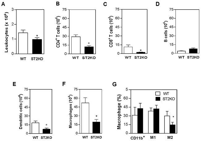 Figure 2: ST2 deficiency is associated with reduced immune cell infiltration in tumors. The frequencies of macrophages (F4/80+), B (CD19+) and T cells (CD4+ and CD8+), and dendritic cells (CD11c+) were determined using immunostaining and FACS analysis in tumor lesions that were harvested from mice on day 126. The bars show (A) the absolute number of leukocytes and the number of (B) CD4+ T lymphocytes, (C) CD8+ T lymphocytes, (D) B lymphocytes, (E) dendritic cells, (F) and macrophages present in the tumor lesions. (G) Frequencies of CD11b+ (myeloid cells), CD119+ (M1) and CD124+ (M2) cells in the tumor microenvironment. The data are representative of three experiments (n = 5 per group). *P < 0.05.