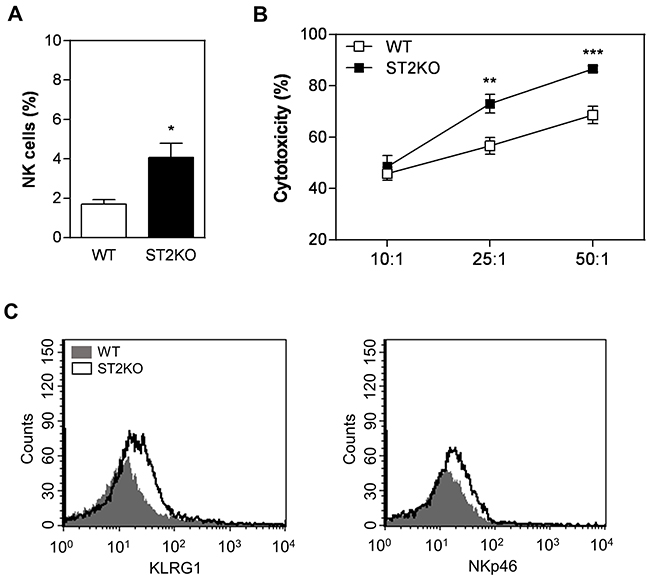 Figure 3: A lack of ST2 is associated with increased NK cytotoxicity. (A) Flow cytometry was used to quantify the proportions of NK cells (CD11b+CD27+) in tumor samples obtained from wild type and ST2KO mice. (B) Flow cytometry analysis of splenic NK cell activity against YAC-1 cells and (C) KLRG1 and NKp46 expression: WT, grey histogram; and ST2KO, empty histogram. The data shown are representative of the mean ± SEM from at least three independent experiments (n = 5 per group). *P < 0.05, **P < 0.01; ***P < 0.001.