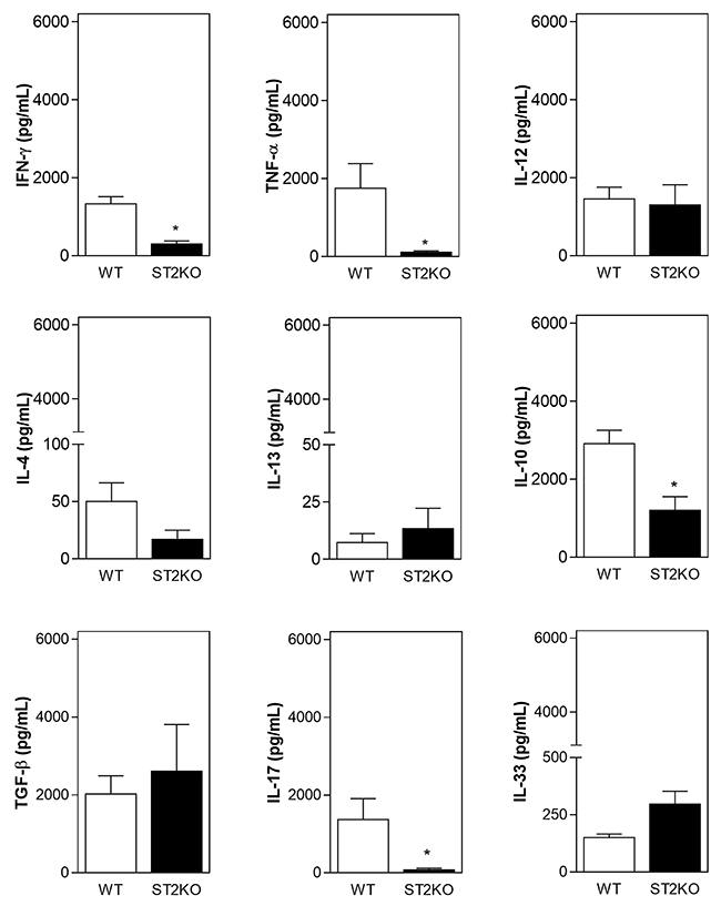 Figure 4: A lack of ST2 is associated with a decrease in the expression of pro-inflammatory cytokines. IFN-γ, TNF-α, IL-12p70, IL-4, IL-10, IL-13, TGF-β, IL-17, and IL-33 levels were measured in supernatants recovered during tumor processing using ELISA. The data are shown as the mean ± SEM and are representative of at least three independent experiments (n = 5 per group). *P < 0.05.